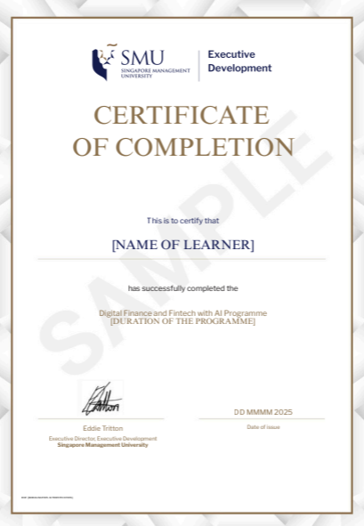 Earn a recognised certificate of completion from Singapore Management University (SMU)—a globally reputed, triple-accredited institution ranked among Asia’s best for business and finance education.