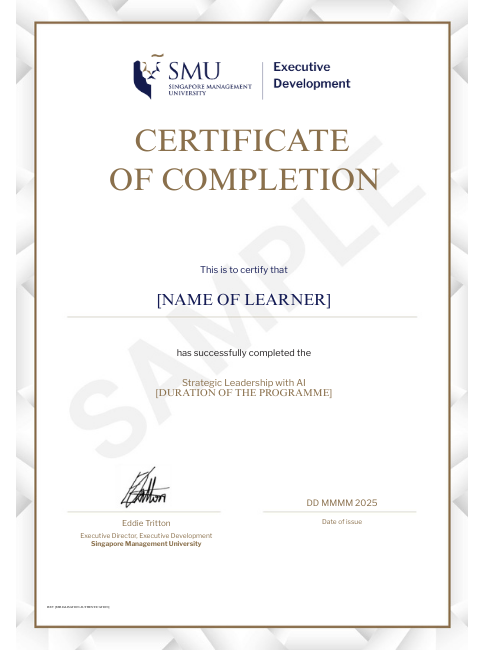 Delivered by Singapore Management University—one of the few institutions in Asia to hold the prestigious "Triple Crown" accreditation (AACSB, EQUIS, and AMBA)— the Strategic Leadership with AI programme lays out the roadmap for AI for business leaders who are ready to move beyond adoption toward reinvention, building intelligent enterprises, redesigning operating models, and leading confidently into the algorithmic decade.